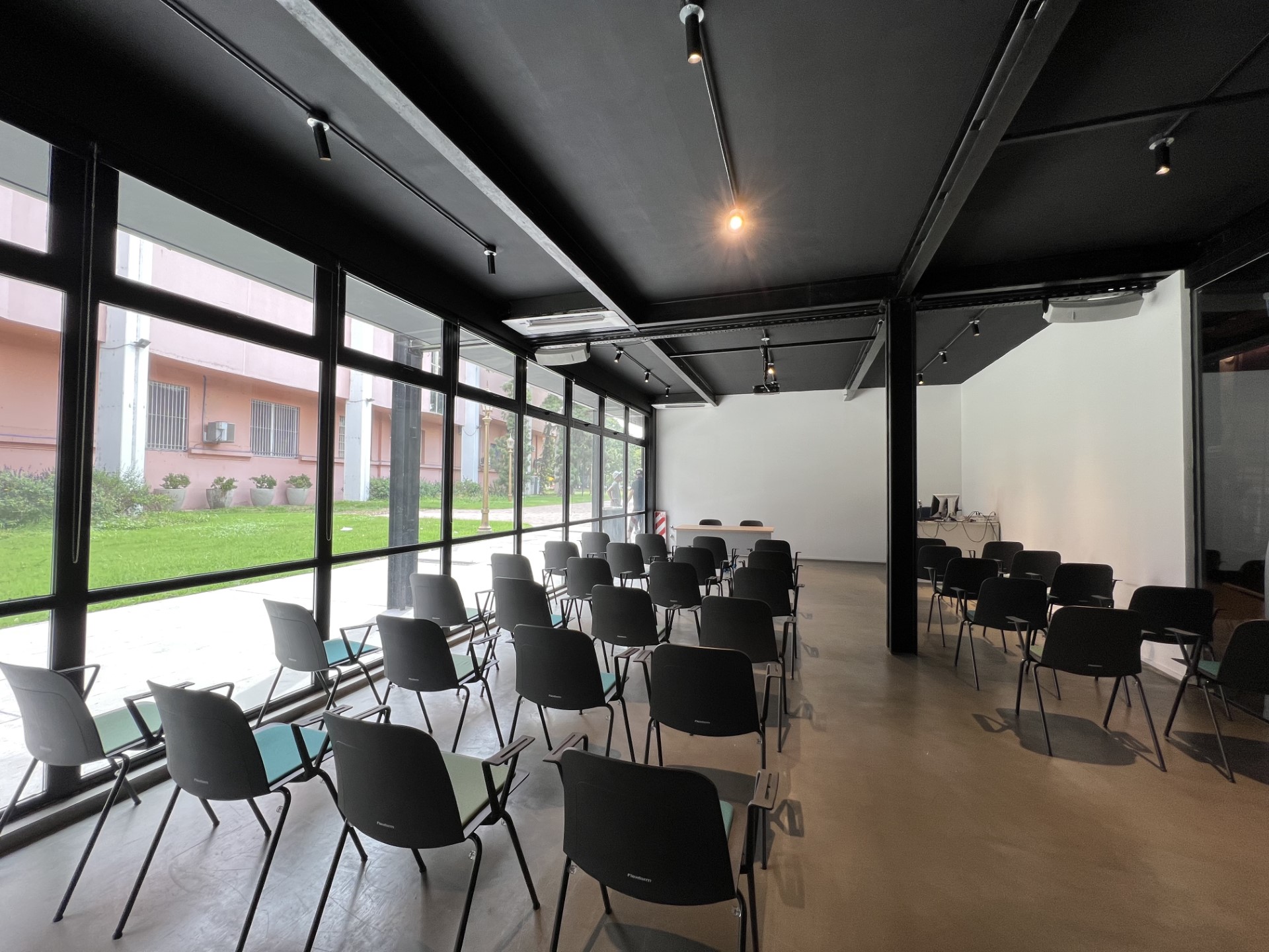 Espacio multiuso equipado para proyecciones audiovisuales, clases, transmisiones online, capacitaciones, workshops, entre otras actividades.
